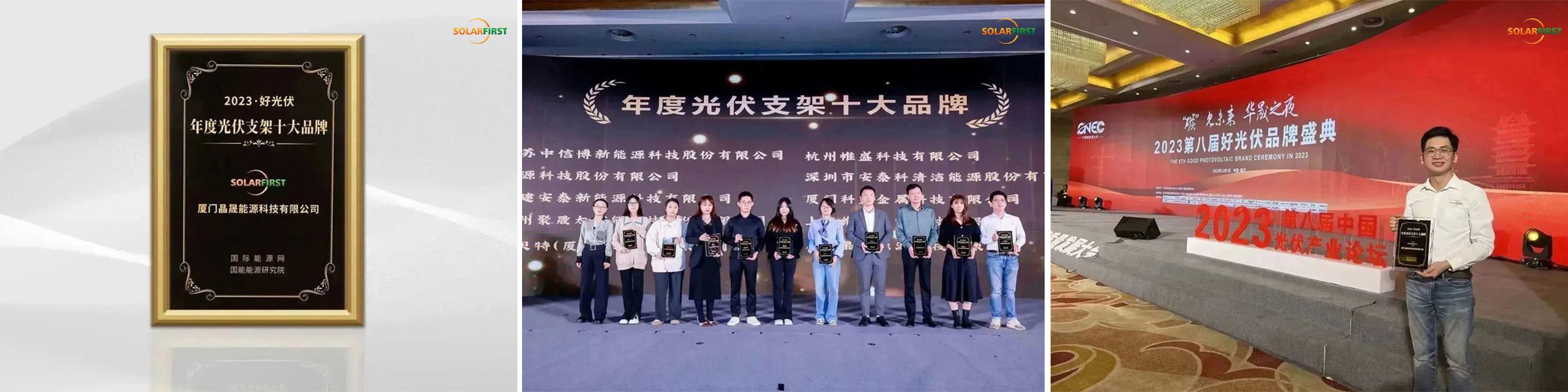 2023年11月6日至8日,中国(临邑)新能源高质量发展大会在山东省临邑市召开。大会由中共临邑市委、临邑市人民政府、国家能源研究所部署,中共临邑市兰山区委、临邑市兰山区人民政府、国际能源网主办。11月7日,在2023中国光伏十大品牌颁奖典礼上,Solar First荣获“2023年度光伏支架十大品牌”殊荣,以表彰其在光伏支架领域取得的卓越创新成就。
