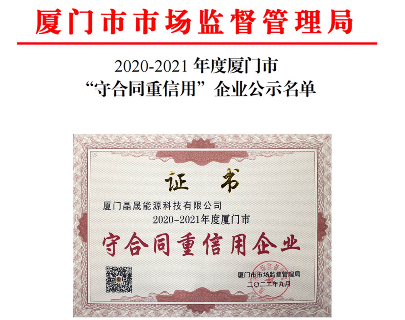 太阳能第一集团荣获厦门市市场监督管理局颁发的2020-2021年度“守合同重信用企业”证书。此次荣获此殊荣是继公司近期获得国家高新技术企业认证之后的又一重要举措。