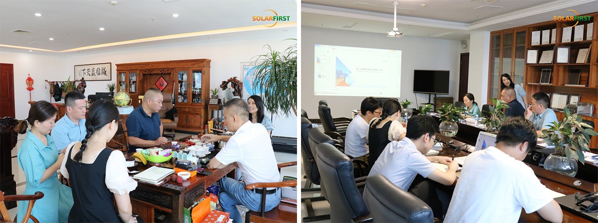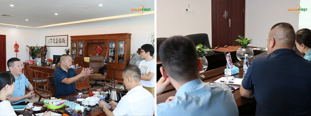 2022年7月21日,信义玻璃工程(东莞)有限公司(简称“信义玻璃”)领导一行到访Solar First集团。代表团成员包括副总裁廖江洪、副总经理李子轩和销售经理周正华。Solar First集团总裁叶松平和董事总经理周平热情接待了代表团一行,就建筑光伏一体化(BIPV)产品研发合作进行了洽谈。