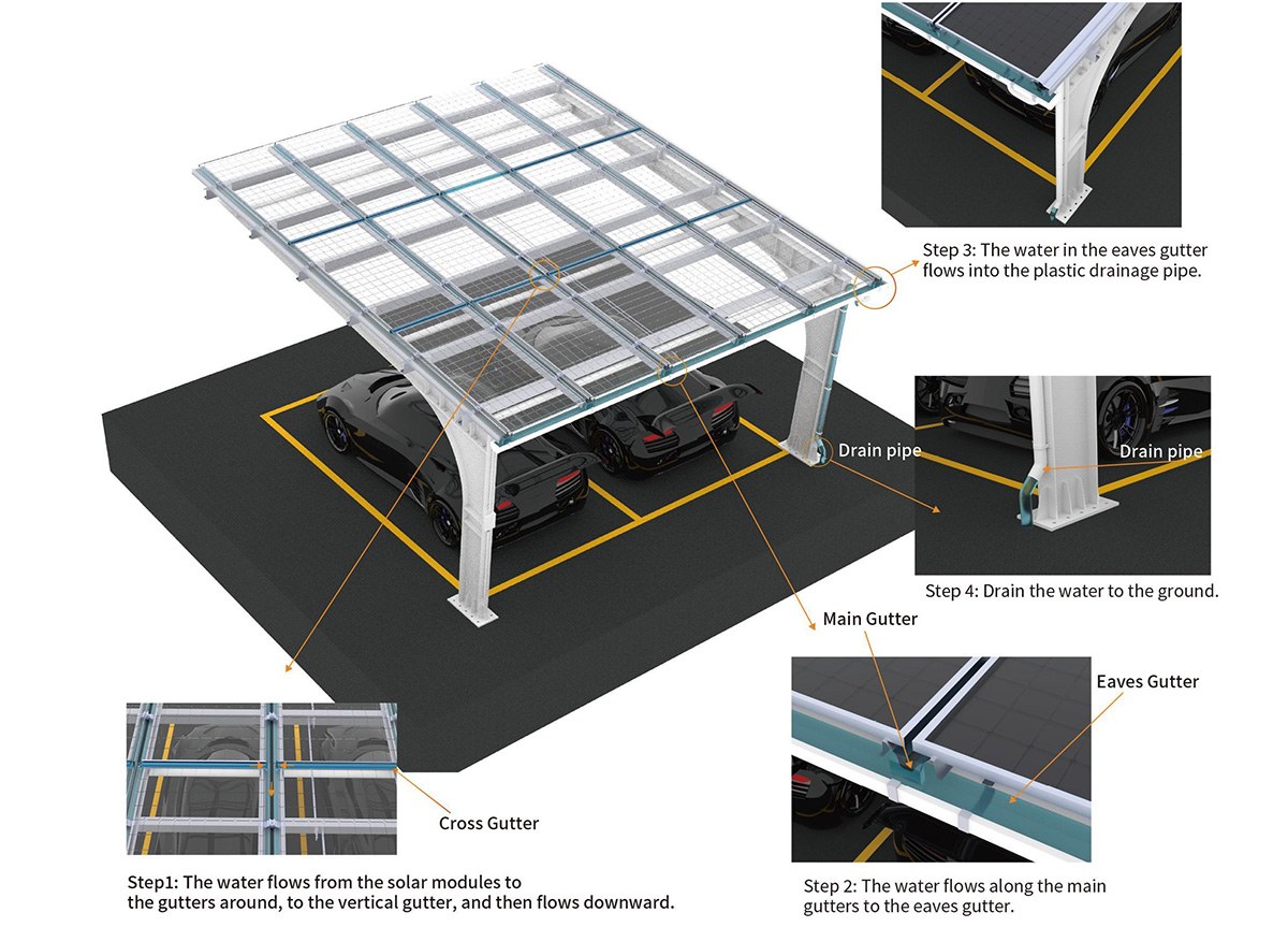 悬臂式钢制车棚采用独特的防水设计,通过集成的排水刀、管道和排水沟,有效地将太阳能模块缝隙中的雨水排出,确保可靠的防风雨性能,无需依赖粘合剂或橡胶填料。其灵活的悬臂结构可无缝适应倾斜和直线停车布局,从而最大限度地提高空间利用率和车辆覆盖率。