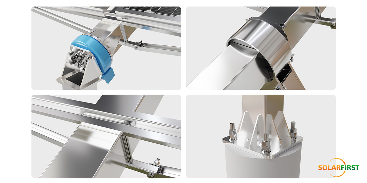 该系统采用热浸镀锌或锌铝镁涂层钢材制成,平均涂层厚度≥80μm,具有卓越的耐腐蚀性和长期耐用性。它适用于多种基础类型——PHC、现浇或钢桩,从而能够在不同场地灵活部署。该跟踪器采用可定制设计,可承受高达40米/秒的风速,兼具智能功能和坚固耐用性,适用于公用事业和商业太阳能项目。